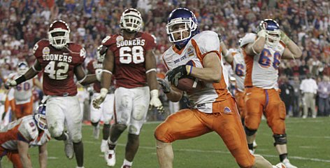 What more could you ask for than to have them go at it in overtime. Oklahoma received first and scored on one play as Adrian Peterson ran for a 25 yard touchdown, his second of the game. Boise took their time using seven plays to score their touchdown. Rather than go for double overtime however, Boise coach Chris Peterson decided to go for it all. The two point conversion. A risky move, because if they fail to convert, Oklahoma wins and the discussion of playoff system in the future ends as well.