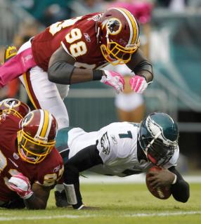 It came as no surprise to me that the Eagles former quarterback received more cheers than boos in the pre-game introductions. He did lead the Eagles to five straight NFC Championship games. One of those resulting in a trip to the Super Bowl, only the second in franchise history. And it came as no surprise that he received more boos when the game was under way. What did surprise me though was the lack of energy, fight or spirit from the Eagles in that game. I mean, you did remember it’s Sunday right? After an Eagles three and out to start the game it only took three plays for the Redskins to score the first touchdown. Shortly there after as the Eagles started to show some life, Michael Vick suffered a rib injury that seemed to destroy the hopes and dreams of an Eagles victory that day. When you look at the final score (17-12) and at the stats, no one had a great game. The Redskins won a crucial game against an opponent in their division and the Eagles lost their starting quarterback and had to bring in their other starting quarterback. McNabb got the win and that’s all that matters for him, but you know he had a good night’s sleep that day. Sticking it the team that traded you away is always gonna put a smile on that players face. Just ask Brett Favre. Why do you think he’s playing into his 40s? Simple answer: Revenge.