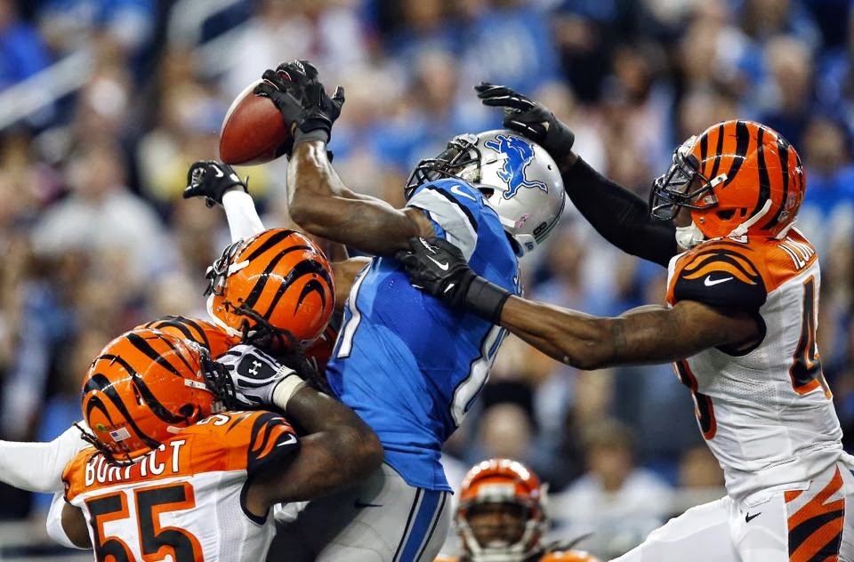 All eyes were waiting for the Sunday night game, but most didn’t see the 4-2 Cincinnati Bengals and the 4-2 Detroit Lions as a game worth watching and I don’t blame them. They are the Bengals and the Lions after all. However, this was a great matchup between two of the games best wide receivers in the Bengals A.J. Green and the Lions Calvin Johnson. First of all, no one should be able to do what Calvin Johnson did in this game (see above). Catching a touchdown pass with three defenders around in the end zone. That does not make sense. Seeing A.J. Green catch and breakaway for an 82 yard opening drive touchdown shouldn’t happen either. Calvin Johnson would add another touchdown to finish with 9 catches for 155 yards. A.J. Green finished with 6 catches for 155 yards and the win. Both teams didn’t turn the ball over and both quarterbacks had great games. Bengals QB Andy Dalton and Lions QB Matthew Stafford threw for over 350 yards with 3 touchdowns. This game showed that both teams are capable of making the playoffs and even making some noise. This also could be a sign of things to come as the Bengals won a big road game while the Lions lost on a late field goal attempt. Either way this was the game of the week had it not been for the Broncos vs. Colts.