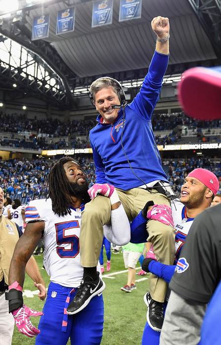 I get why the Buffalo Bills decided to carry Jim Schwartz off the field after beating the Detroit Lions. He was the head coach there for five seasons with only one playoff appearance. It was a redemption or revenge kind of thing. Fine, no big deal. However, Jim Schwartz isn’t the head coach of the Buffalo Bills. He’s the defensive coordinator. Since when does that happen? And during a game early in the regular season. Detroit Lions WR Golden Tate said afterwards that it was a “douche move” by the Bills. Great quote by the way Tate. I take it the reason why he called it is because apparently it was planned before the game. It wasn’t a spontaneous thing. To me that isn’t a big deal either. What’s weird to me is that he isn’t the head coach of any team. Just a coordinator. Am I off base for finding a problem with this?