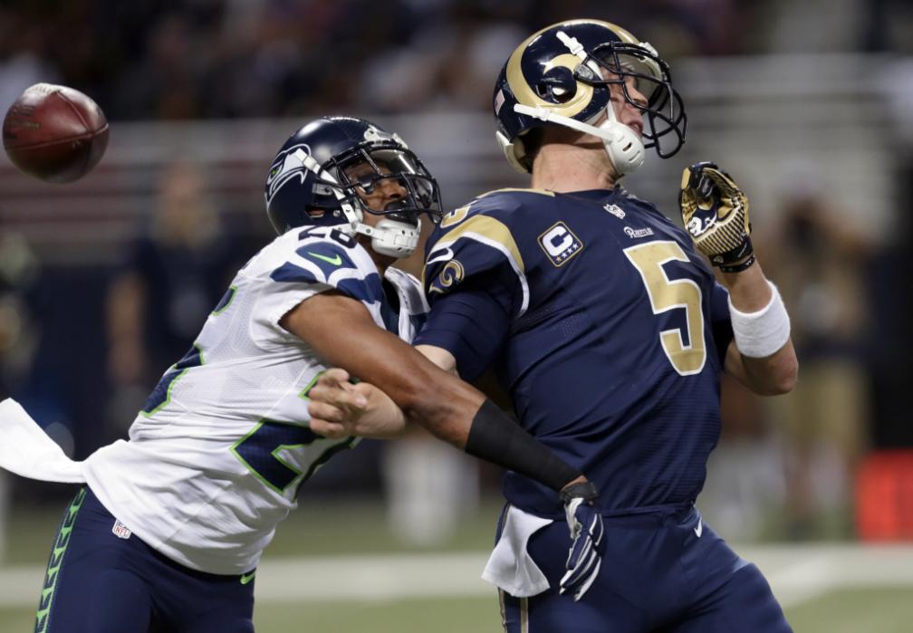 St. Louis Rams quarterback Nick Foles, right, fumbles as he is hit by Seattle Seahawks defensive back Cary Williams while throwing during the fourth quarter of an NFL football game Sunday, Sept. 13, 2015, in St. Louis. Williams recovered the fumble and returned the ball for a touchdown. (AP Photo/Tom Gannam)