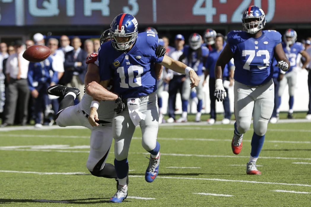 New York Giants quarterback Eli Manning, front, fumbles the ball as Atlanta Falcons outside linebacker Kroy Biermann makes the hit during the second half of an NFL football game, Sunday, Sept. 20, 2015, in East Rutherford, N.J. (AP Photo/Seth Wenig)