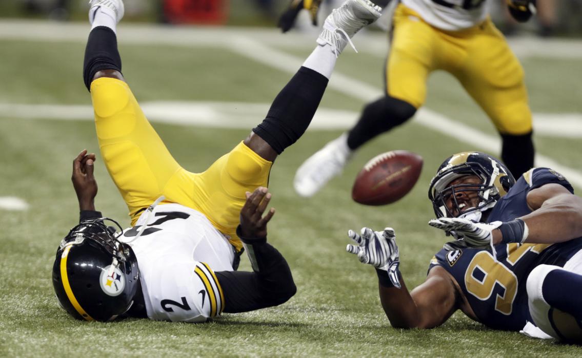Pittsburgh Steelers quarterback Michael Vick, left, loses the ball as he is hit by St. Louis Rams defensive end Robert Quinn during the fourth quarter of an NFL football game Sunday, Sept. 27, 2015, in St. Louis. The Steelers recovered the fumble. (AP Photo/Tom Gannam)