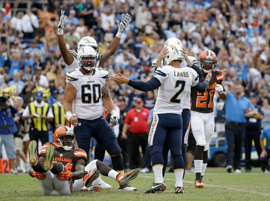 SAN DIEGO, CA – OCTOBER 04: Josh Lambo #2 of the San Diego Chargers celebrates with his teammates after hitting the game winning field goal, as Johnson Bademosi #24 of the Cleveland Browns looks on from the ground at Qualcomm Stadium on October 4, 2015 in San Diego, California. The Chargers defeated the Browns 30-27. (Photo by Jeff Gross/Getty Images)