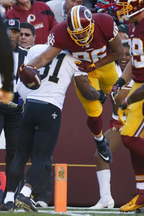Washington Redskins tight end Jordan Reed (86) leaps over New Orleans Saints free safety Jairus Byrd (31) to score a touchdown during the first half of an NFL football game in Landover, Md., Sunday, Nov. 15, 2015. (AP Photo/Alex Brandon)