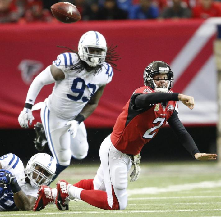 Atlanta Falcons quarterback Matt Ryan (2) tries to pass against the Indianapolis Colts during the first of an NFL football game, Sunday, Nov. 22, 2015, in Atlanta. (AP Photo/John Bazemore)