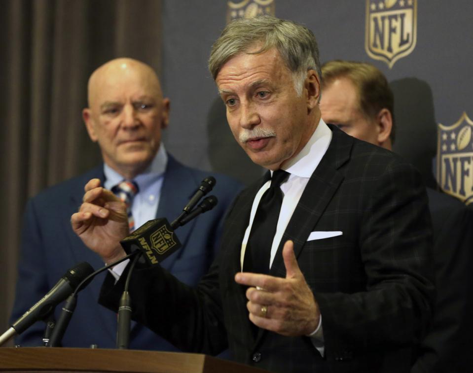 St. Louis Rams owner Stan Kroenke talks to the media after team owners voted Tuesday, Jan. 12, 2016, in Houston, to allow the Rams to move to a new stadium just outside Los Angeles, and the San Diego Chargers will have an option to share the facility. Houston Texans owner Bob McNair stands to his left. (AP Photo/Pat Sullivan)