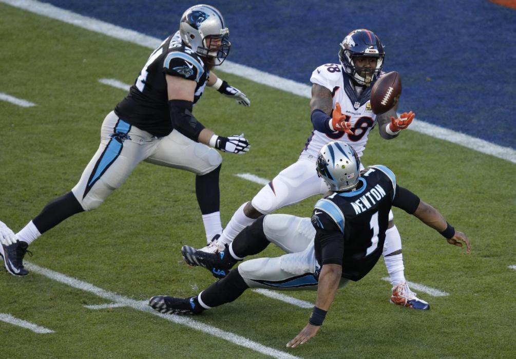 Denver Broncos Von Miller (58) strips the ball from Carolina Panthers Cam Newton (1) during the first half of the NFL Super Bowl 50 football game Sunday, Feb. 7, 2016, in Santa Clara, Calif. The Broncos recovered the ball for a touchdown. (AP Photo/Charlie Riedel)