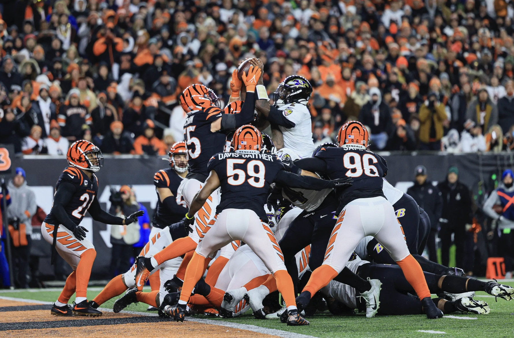 The momentum for most of the game was in favor of the Baltimore Ravens. The game was tied at 17 in the 4th quarter and the Ravens were 2 yards away from the end zone. QB Tyler Huntley tries to jump over the top for the touchdown but was stymied immediately and then fumbled the ball. Cincinnati Bengals DE Sam Hubbard picks it up and then returns it for the go-ahead touchdown. The Ravens did have a near touchdown, pending an extra point or 2-point conversion to win the game as time expired, but it was off a receiver’s finger tips. The Bengals dodged a bullet with this one and they’ll have to be better going forward.