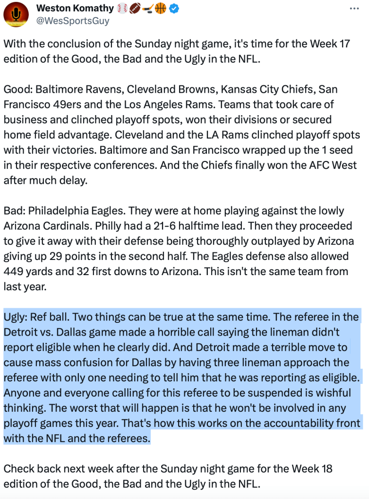 Note the highlighted portion. You probably know by now what transpired during the Detroit Lions vs. Dallas Cowboys game this past week. This isn’t new with the NFL as it’s been happening for a very long time. What I and others have been clamoring for is some accountability for poor refereeing. What you might not know is that this isn’t the referees only job. They aren’t doing this on a full-time basis. They have other careers and working NFL games is a part-time job. Maybe a solution should be to finally have full-time referees. In turn that could lead to the accountability that has been needed for some time. As I stated in the above tweet, the only punishment for this crew, who has been apart of numerous bad calls or no-calls this season, is that they will not work a single playoff game this year. Now with that said, the Detroit Lions deserve some scrutiny on their head coach Dan Campbell. Not just for the decision to still go for the 2-point conversion after the Dallas Cowboys were called for an offside, where the Lions could just kick an extra point and go into overtime. They should have kicked a field goal in the 2nd quarter instead of going for it on 4th down at the Cowboys 4-yard line. Those extra three points could have come in handy late in the game I would imagine. I appreciate the aggressiveness of Dan Campbell to go for it on 4th down and win games going for the 2-point conversion. There’s a time and a place though and this one cost them the second seed in the NFC.